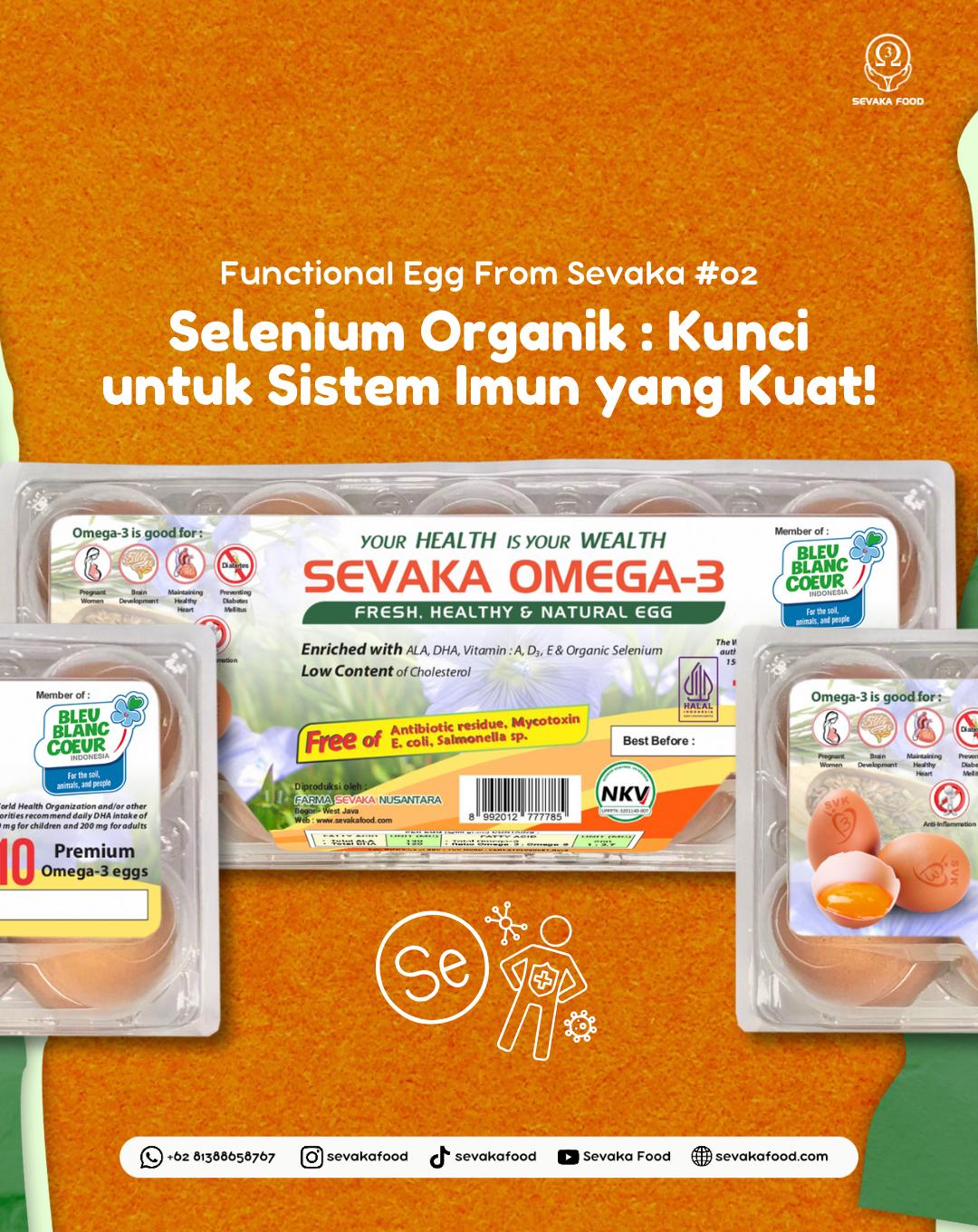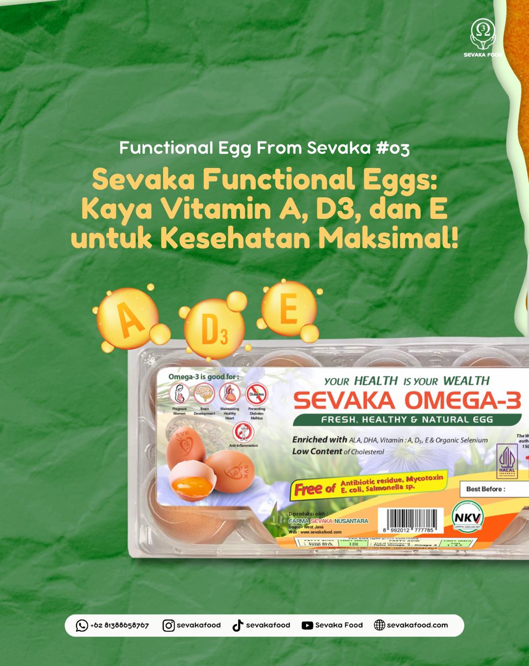 Sevaka Functional Egg: Kaya Vitamin A, D3, dan E untuk Kesehatan Maksimal Telur Sevaka Omega-3 diperkaya antioksidan alami Vitamin A, D3, dan E yang penting untuk kesehatan tubuh. Vitamin A menjaga kesehatan mata dan sistem imun Vitamin D3 mendukung…
