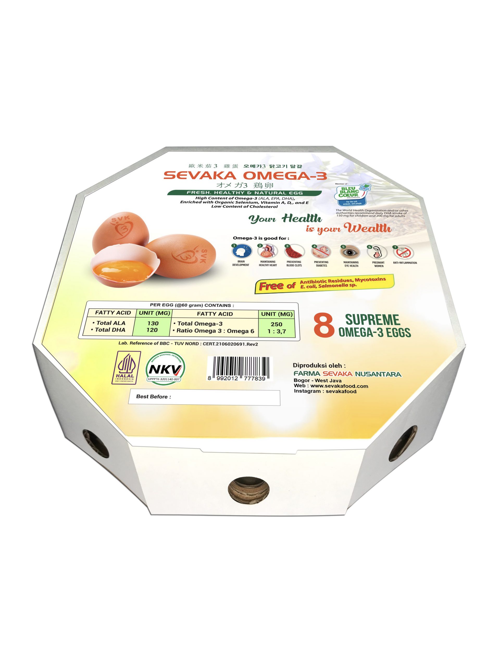 SEVAKA OMEGA-3 EGG adalah telur yang mengandung nutrisi asam lemak OMEGA-3 dalam konsentrasi dan perbandingan yang sesuai dengan rekomendasi World Health Organization (WHO) dan Bleu Blanc Coeur (BBC).